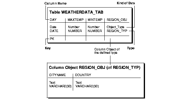 The table, Weatherdata_tab, contains columns for the minimum daily temperature (Mintemp), maximum daily temperature (Maxtemp), the day the temperature was recorded (Day), and the Region (Region_Obj). Region_Obj is an object column that contains columns for country (Country) and city (Cityname). Figure 5-2 illustrates the Weatherdata_tab schema.