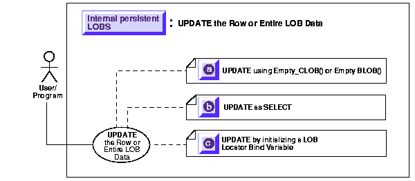 For information on how to UPDATE a LOB when binds of more than 4,000 bytes are involved, see the following sections in Chapter 7, "Modeling and Design":