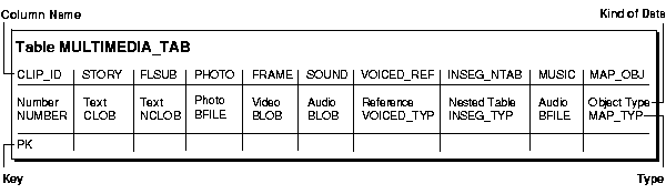 The heart of our hypothetical application is the table Multimedia_tab. The varied types which make up the columns of this table make it possible to collect together the many different kinds multimedia elements used in the composition of clips.