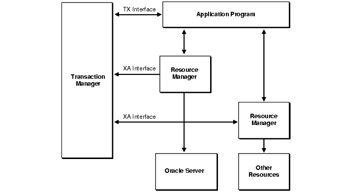 X/Open applications run in a distributed transaction processing (DTP) environment. In an abstract model, an X/Open application calls on resource managers (RMs) to provide a variety of services. For example, a database resource manager provides access to data in a database. Resource managers interact with a transaction manager (TM), which controls all transactions for the application.