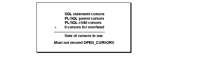 The maximum number of cursors your program cans use simultaneously is determined by the database initialization parameter OPEN_CURSORS. Normally, the precompiler allows management of statement cursors, to prevent OPEN_CURSORS being exceeded, using the precompiler options HOLD_CURSOR, RELEASE_CURSOR and MAXOPENCURSORS (For more details on this subject, see "Embedded PL/SQL Considerations".). While executing an embedded PL/SQL block there will be one cursor, the parent cursor, associated with the entire PL/SQL block and a separate child cursor for each statement executed during the execution of the PL/SQL block. Because the PL/SQL block is passed to the server for execution, only the parent cursor can be tracked by the precompiler runtime library and so it is possible for applications that use a lot of cursors in this way to exceed OPEN_CURSORS. Figure 6-1 shows how to calculate the maximum number of cursors used.