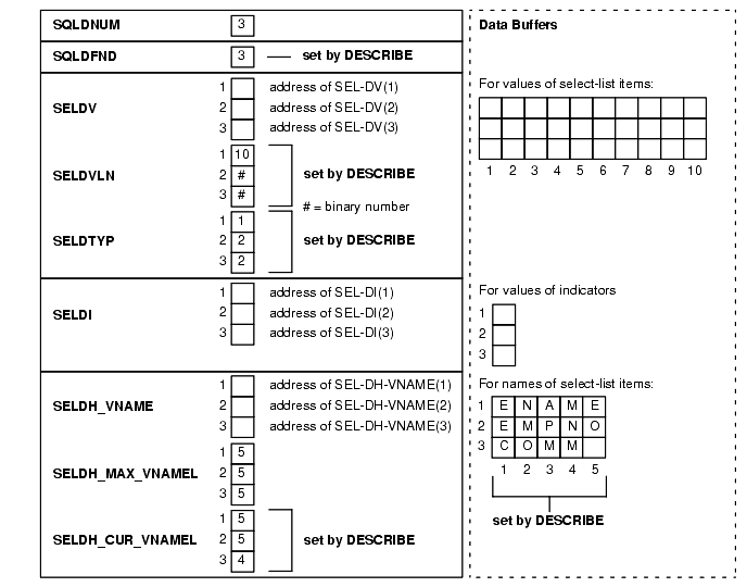 directs the database to store FETCHed select-list values in the data buffers addressed by SELDV(1) through SELDV(SQLDNUM). Thus, database stores the Jth select-list value in SEL-DV(J).