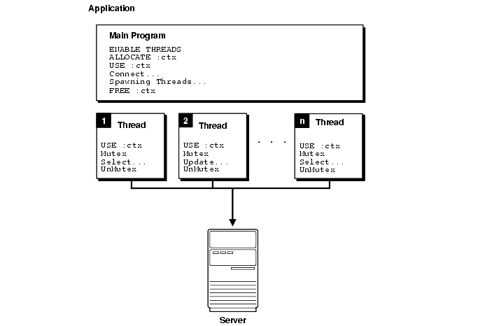 Figure 12-2 shows an application running in a multithreaded environment. The various threads share a single runtime context to process one or more SQL statements. Again, runtime contexts cannot be shared by multiple threads at the same time. The mutexes in Figure 12-2 show how to prevent concurrent usage.