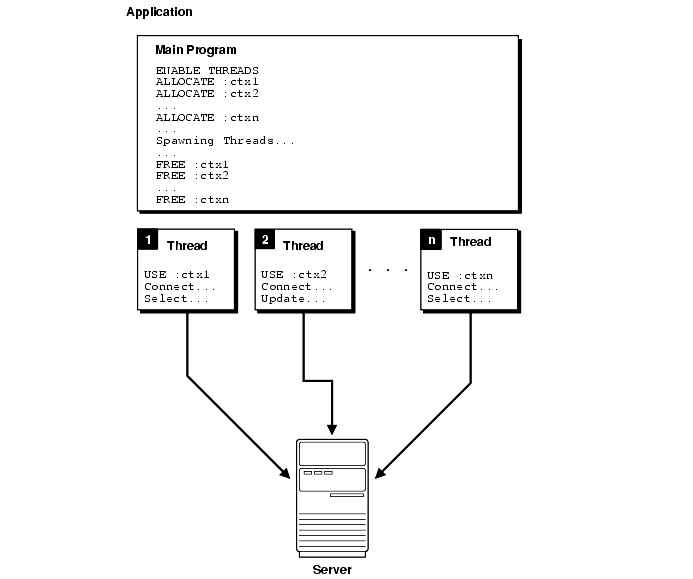 IDENTIFICATION DIVISION. PROGRAM-ID. MAIN. ... * declare two context areas 01 CTX1 SQL-CONTEXT. 01 CTX2 SQL-CONTEXT. PROCEDURE DIVISION. * enable threading EXEC SQL ENABLE THREADS END-EXEC. * allocate context areas EXEC SQL CONTEXT ALLOCATE :CTX1 END-EXEC. EXEC SQL CONTEXT ALLOCATE :CTX2 END-EXEC. * include your code to start thread "SUBPGM1" using CTX1 here. EXEC SQL CONTEXT USE :CTX2 END-EXEC. * all statement physically following the above will use CTX2 EXEC SQL CONNECT :USERID END-EXEC. EXEC SQL INSERT ..... ...