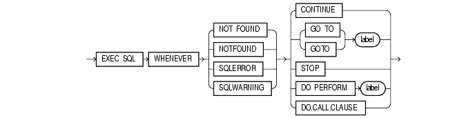 EXEC SQL WHENEVER NOT FOUND CONTINUE END-EXEC. ... EXEC SQL WHENEVER SQLERROR GOTO SQL-ERROR END-EXEC. ... SQL-ERROR. EXEC SQL WHENEVER SQLERROR CONTINUE END-EXEC. DISPLAY "ORACLE ERROR DETECTED.". EXEC SQL ROLLBACK RELEASE END-EXEC. STOP RUN.