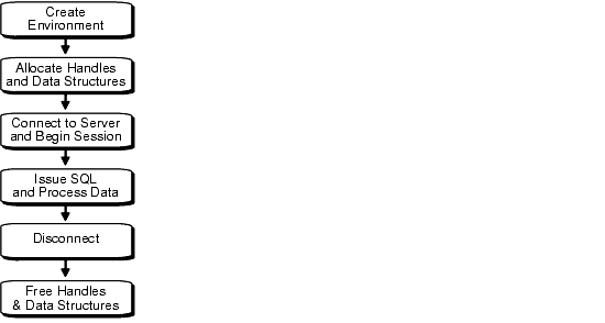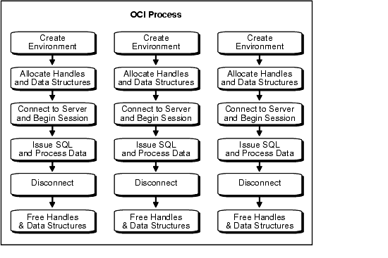 Figure 2-1, "Basic OCI Program Flow" illustrates the flow of steps in an OCI application. Each step is described in more detail in the section "OCI Programming Steps".