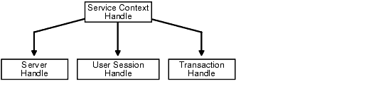 A service context handle defines attributes that determine the operational context for OCI calls to a server. The service context contains three handles as its attributes, that represent a server connection, a user session, and a transaction. These attributes are illustrated in Figure 2-4, "Components of a Service Context"the following figure.