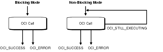 The Oracle OCI provides the ability to establish a server connection in blocking mode or non-blocking mode. When a connection is made in blocking mode, an OCI call returns control to an OCI client application only when the call completes, either successfully or in error. With the non-blocking mode, control is immediately returned to the OCI program if the call could not complete, and the call returns a value of OCI_STILL_EXECUTING. The two modes are illustrated in Figure 2-7.