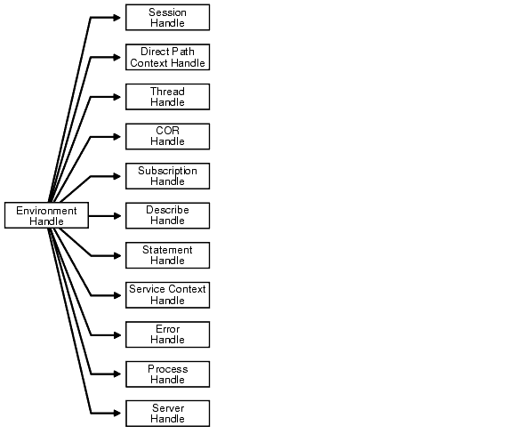 Your application allocates all handles (except the bind, define, and thread handles) with respect to particular environment handle. You pass the environment handle as one of the parameters to the handle allocation call. The allocated handles is then specific to that particular environment.