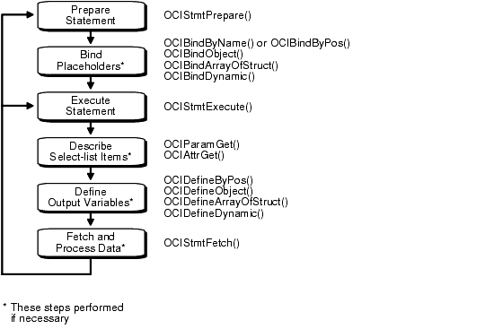 Once you have allocated the necessary handles and attached to a server, the basic steps in processing a SQL statement are the following, as illustrated in Figure 4-1, "Steps In Processing SQL Statements":