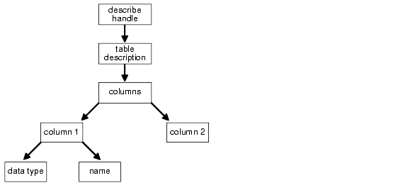For example, an OCIAttrGet() on the describe handle for the table can return a handle to the column-list information. An application can then use OCIParamGet() to retrieve the handle to the column description of a particular column in the column-list. The handle to the column descriptor can be passed to OCIAttrGet() to get further information about the column, such as the name and data type (as illustrated by following the left-hand side of the above figure).