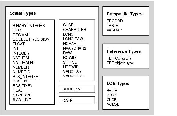 Figure 2-1 shows the predefined datatypes available for your use. The scalar types fall into four families, which store number, character, Boolean, and date/time data, respectively.