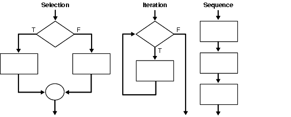 The selection structure tests a condition, then executes one sequence of statements instead of another, depending on whether the condition is true or false. A condition is any variable or expression that returns a Boolean value (TRUE or FALSE). The iteration structure executes a sequence of statements repeatedly as long as a condition holds true. The sequence structure simply executes a sequence of statements in the order in which they occur.