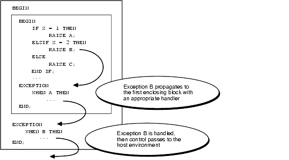 DECLARE out_of_balance EXCEPTION; BEGIN ... BEGIN ---------- sub-block begins ... IF ... THEN RAISE out_of_balance; -- raise the exception END IF; EXCEPTION WHEN out_of_balance THEN -- handle the error RAISE; -- reraise the current exception END; ------------ sub-block ends EXCEPTION WHEN out_of_balance THEN -- handle the error differently ... END;