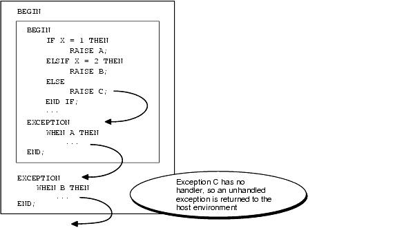 Remember, if it cannot find a handler for a raised exception, PL/SQL returns an unhandled exception error to the host environment, which determines the outcome. For example, in the Oracle Precompilers environment, any database changes made by a failed SQL statement or PL/SQL block are rolled back.