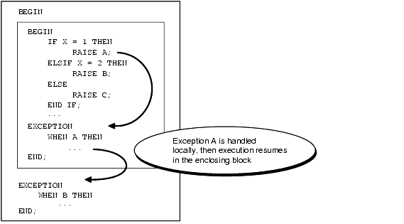 To catch raised exceptions, you write exception handlers. Each handler consists of a WHEN clause, which specifies an exception, followed by a sequence of statements to be executed when that exception is raised. These statements complete execution of the block or subprogram; control does not return to where the exception was raised. In other words, you cannot resume processing where you left off.