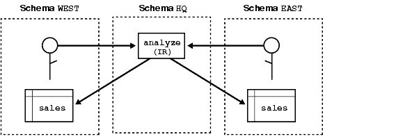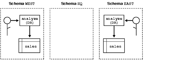 To solve the problem, the company installs an invoker-rights (IR) version of procedure analyze at headquarters. Now, as Figure 7-3 shows, all regional sites can use the same procedure to query their own sales tables.