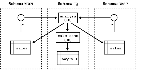 To restrict access to sensitive data, you can have an invoker-rights routine call a definer-rights routine. Suppose headquarters would like procedure analyze to calculate sales commissions and update a central payroll table.