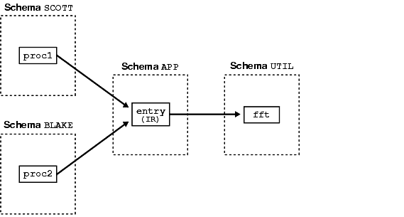 Notice that routine util.fft is called directly only from invoker-rights routine app.entry. So, user util must grant the EXECUTE privilege only to user app. When util.fft is executed, its current user could be app, scott, or blake even though scott and blake were not granted the EXECUTE privilege.