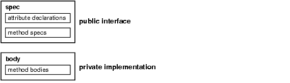 Like a package, an object type has two parts: a specification and a body (refer to Figure 9-3). The specification (spec for short) is the interface to your applications; it declares a data structure (set of attributes) along with the operations (methods) needed to manipulate the data. The body fully defines the methods, and so implements the spec.