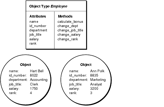When you define an object type using the CREATE TYPE statement, you create an abstract template for some real-world object. The template specifies only those attributes and behaviors the object will need in the application environment. For example, an employee has many attributes, but usually only a few are needed to fill the requirements of an application (see Figure 9-1).