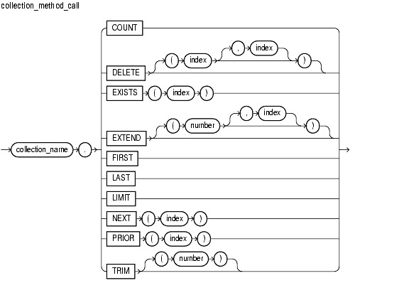 EXISTS, COUNT, LIMIT, FIRST, LAST, PRIOR, and NEXT are functions, which appear as part of an expression. EXTEND, TRIM, and DELETE are procedures, which appear as a statement. EXISTS, PRIOR, NEXT, TRIM, EXTEND, and DELETE take integer parameters. ssion. EXTEND and TRIM cannot be used with index-by tables.