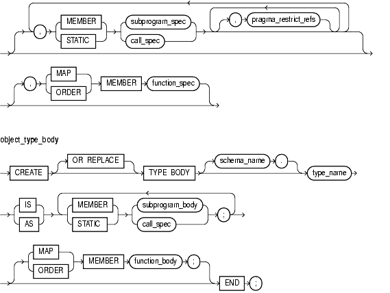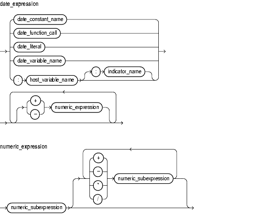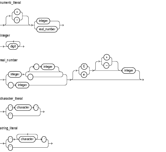 Each diagram defines a syntactic element. Every path through the diagram describes a possible form of that element. Follow in the direction of the arrows. If a line loops back on itself, you can repeat the element enclosed by the loop.