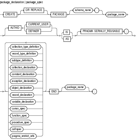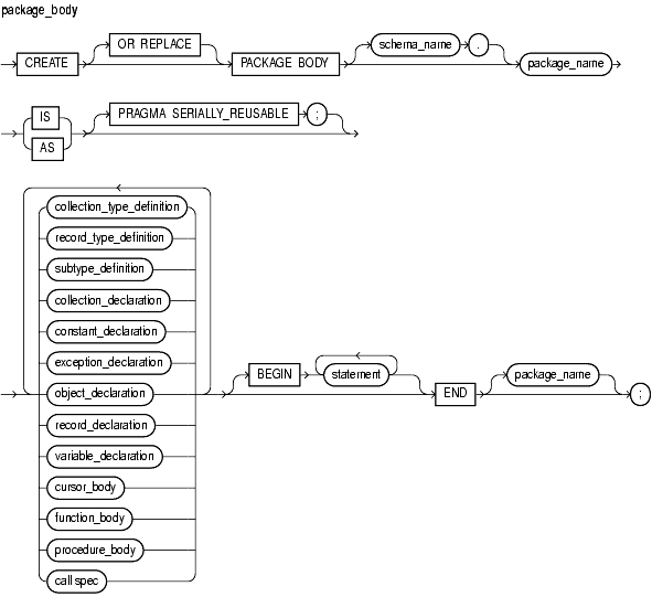 CREATE PACKAGE pkg1 IS PRAGMA SERIALLY_REUSABLE; num NUMBER := 0; PROCEDURE init_pkg_state(n NUMBER); PROCEDURE print_pkg_state; END pkg1; CREATE PACKAGE BODY pkg1 IS PRAGMA SERIALLY_REUSABLE; PROCEDURE init_pkg_state (n NUMBER) IS BEGIN pkg1.num := n; END; PROCEDURE print_pkg_state IS BEGIN DBMS_OUTPUT.PUT_LINE('Num: ' || pkg1.num); END; END pkg1;