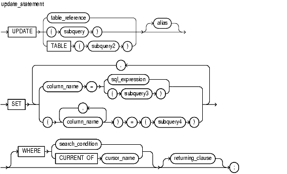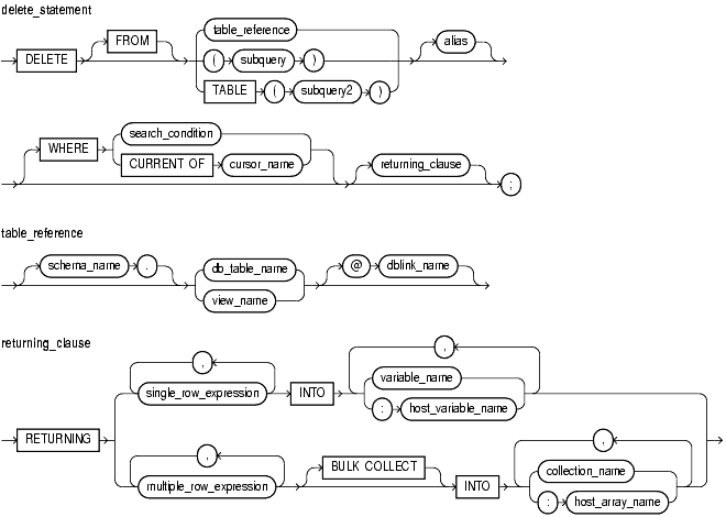 This clause lets you return values from updated rows, thereby eliminating the need to SELECT the rows afterward. You can retrieve the column values into variables and/or host variables, or into collections and/or host arrays. However, you cannot use the RETURNING clause for remote or parallel updates. For the syntax of returning_clause, see "DELETE Statement".