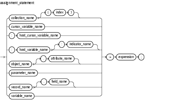 This is an arbitrarily complex combination of variables, constants, literals, operators, and function calls. The simplest expression consists of a single variable. For the syntax of expression, see "Expressions". When the assignment statement is executed, the expression is evaluated and the resulting value is stored in the assignment target. The value and target must have compatible datatypes.