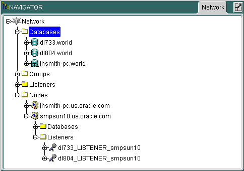 The Navigator pane displays a hierarchical tree view of all discovered objects in the network, giving an administrator a big picture of the relationships among the objects. The Navigator pane displays folders for databases, groups, listeners, nodes, as well as folders for any other types of services as they are discovered.