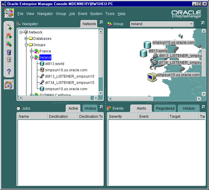 The Oracle Enterprise Manager Console is an easy-to-use, customizable graphical user interface that provides a single point of access to your entire network environment. The console has four panes: the Navigator, Group, Jobs, and Events panes.
