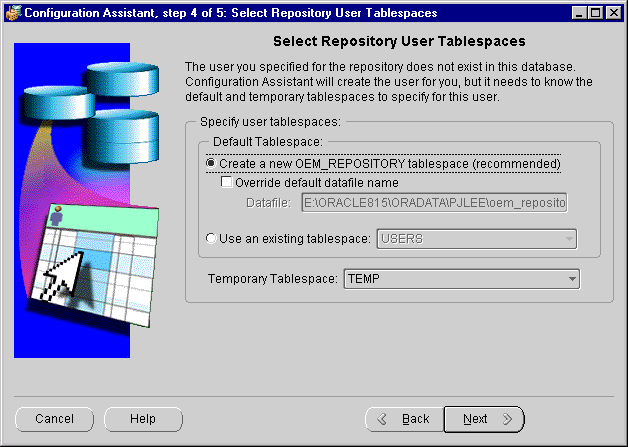 If the OEM_REPOSITORY tablespace already exists, the following screen appears.