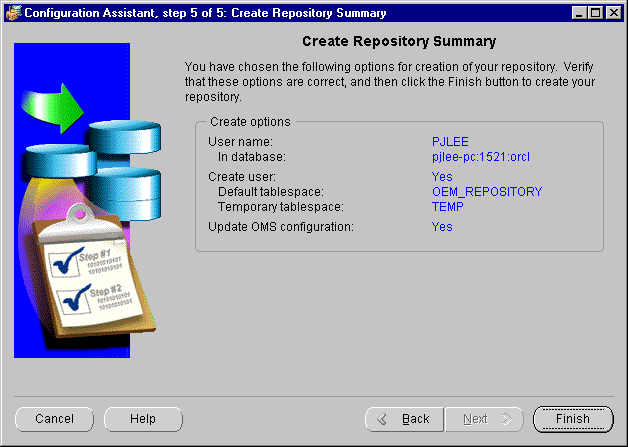 If the Enterprise Manager Configuration Assistant detects that the default tablespace for the repository contains the required amount of free space, the "Create Repository Summary" page appears.