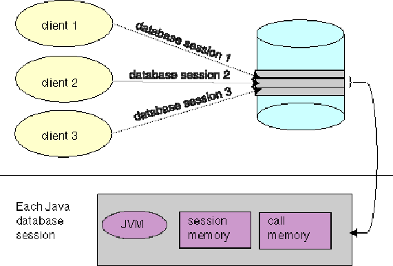 As demonstrated in Figure 2-1, each Java client starts up a database session as the environment for executing Java within the database. Garbage collection, session memory, and call memory exist solely for each client within its session.