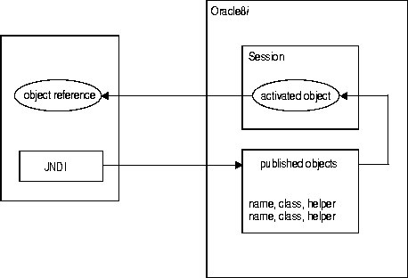With both EJB and CORBA applications, access to server-side objects is similar. You publish objects in the Oracle database using the OMG CosNaming service, which you can access using Oracle's JNDI interface to CosNaming. CORBA developers can also use the pure CosNaming approach. EJB developers must follow the EJB specification and use JNDI for access.