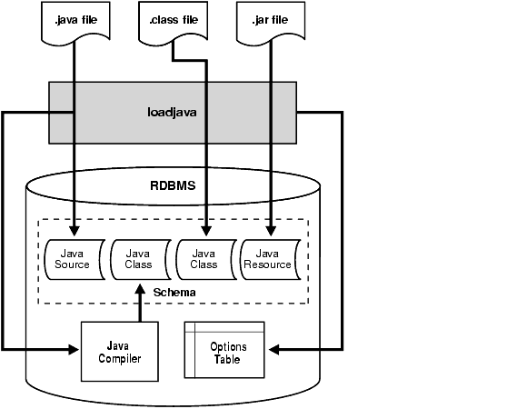 The figure also shows that loadjava can set the values of options stored in a system database table. Among other things, these options affect the processing of Java source files. For example, the option -encoding localizes Java source files by specifying their character-encoding scheme. (For more information about the options table, see "Passing Options to the Compiler".)