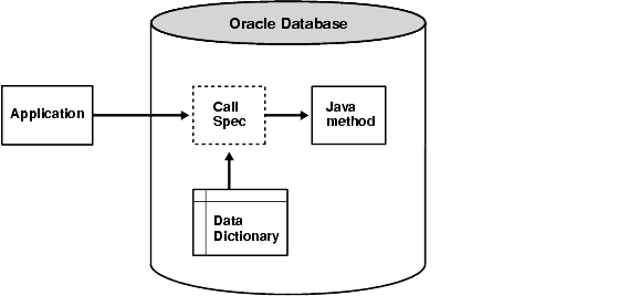As Figure 3-1 shows, applications call the Java method through its call spec, that is, by referencing the call-spec name. The run-time system looks up the call-spec definition in the Oracle data dictionary, then executes the corresponding Java method.