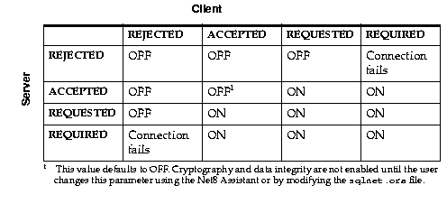 To negotiate whether to turn on encryption or integrity, you can specify four possible values for the Oracle Advanced Security encryption and integrity configuration parameters. The four values are listed below in the order of increasing security. The value REJECTED provides the minimum amount of security between client and server communications, and the value REQUIRED provides the maximum amount of network security.