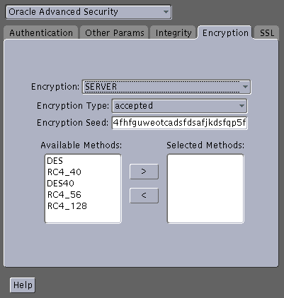 SQLNET.ENCRYPTION_SERVER = [accepted | rejected | requested | required] SQLNET.ENCRYPTION_TYPES_SERVER = (valid_encryption_algorithm [,valid_ encryption_algorithm]) SQLNET.CRYPTO_SEED = "10-70 random characters"