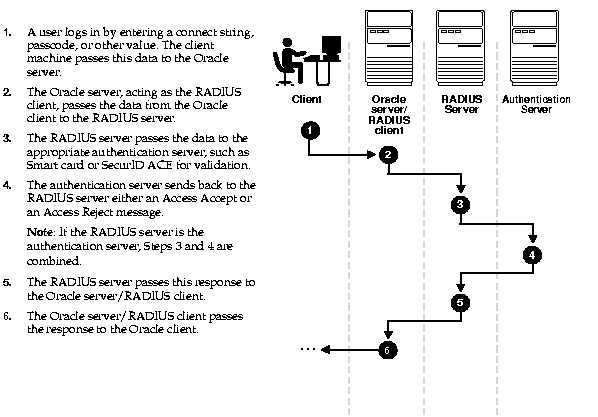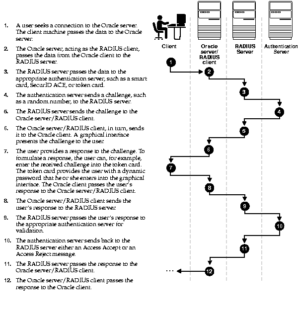 From the user's perspective, the entire authentication process takes place seamlessly and transparently. When the user seeks access to an Oracle server, the Oracle server, acting as the RADIUS client, notifies the RADIUS server. The RADIUS server then: