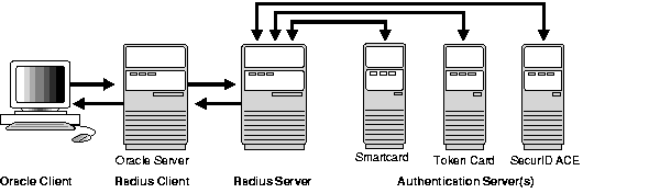 You can enable the network to use any authentication method that supports the RADIUS standard, including token cards and smart cards, simply by installing and configuring the RADIUS feature. Moreover, when you use RADIUS, you can change the authentication method without modifying either the Oracle client or the Oracle server.