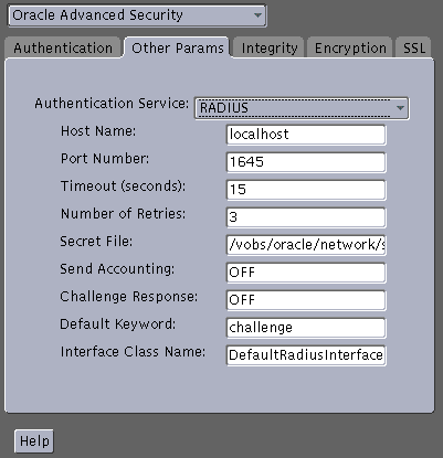SQLNET.RADIUS_CHALLENGE_RESPONSE=([ON | OFF]) SQLNET.RADIUS_CHALLENGE_KEYWORD=(KEYWORD) SQLNET.RADIUS_AUTHENTICATION_INTERFACE=(name of interface including the package name delimited by "/" for ".")