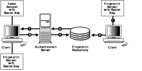 Each user who wants to use the system must place a fingerprint on a TouchSafe II or TouchSafe II Desktop Sensor. The client-side adapter sends an authentication request to the server-side adapter which uses the previously enrolled fingerprint stored in the authentication server for comparison. For each authentication request from a client, the authentication server retrieves and sends the user's fingerprint and the database server's security policy back to the client-side adapter via the server-side adapter.