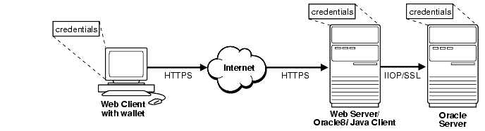 Figure 10-2 shows an example of using SSL to secure connections between Oracle and non-Oracle entities, beginning over the Internet and proceeding to an Oracle server. In this example, a Web server runs as an Oracle8i Java client. It receives messages over HTTPS (HTTP secured by SSL), and sends CORBA requests to the Oracle server via a servlet over IIOP/SSL (IIOP secured by SSL). Note that, in this example, the Web server passes its own certificate, and not the Web client's, to the Oracle server.