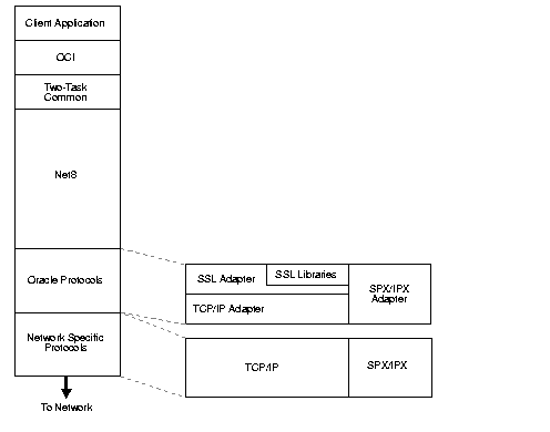 In an Oracle environment, SSL operates at the Oracle Protocols layer using TCP/IP as illustrated in Figure 10-1.