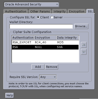 Warning: You can use SSL encryption in combination with another Oracle Advanced Security authentication method. When you do this, you must disable any non-SSL encryption to comply with government regulations prohibiting double encryption. If you do not do this, the connection fails. You cannot use SSL authentication with Oracle Advanced Security encryption. For information on how to disable Oracle Advanced Security encryption, see Chapter 2, "Configuring Data Encryption and Integrity." |