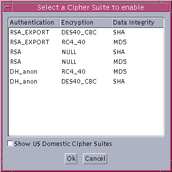 You would typically prioritize cipher suites starting with the strongest and moving to the weakest. The following two tables list the available SSL cipher suites supported in both the domestic and export editions of Oracle Advanced Security. These tables also list the authentication, encryption, and data integrity types each cipher suite uses.