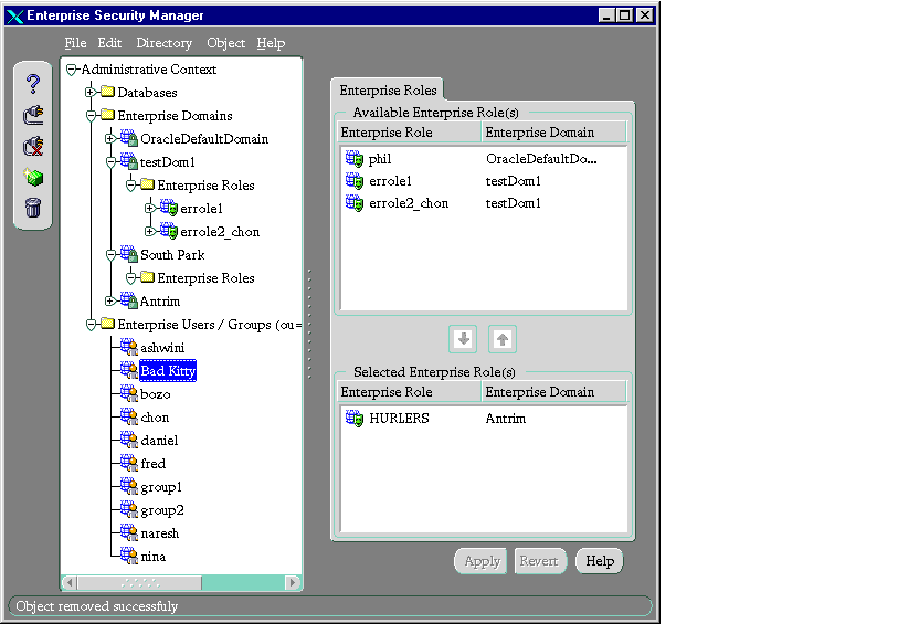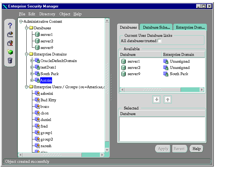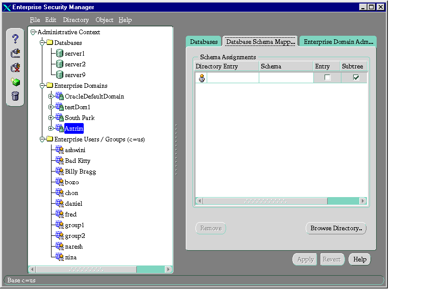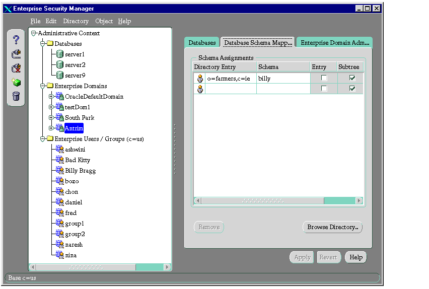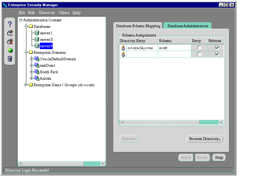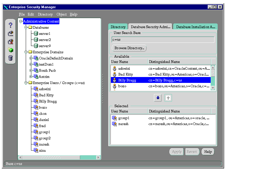 This chapter describes how an enterprise database administrator uses Oracle Enterprise Security Manager to administer database security in an enterprise domain of Oracle8i databases.