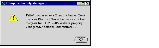 In this case, you can exit Oracle Enterprise Security Manager and run Net8 Configuration Assistant to set up directory access, then restart Oracle Enterprise Security Manager. Alternatively, you can: